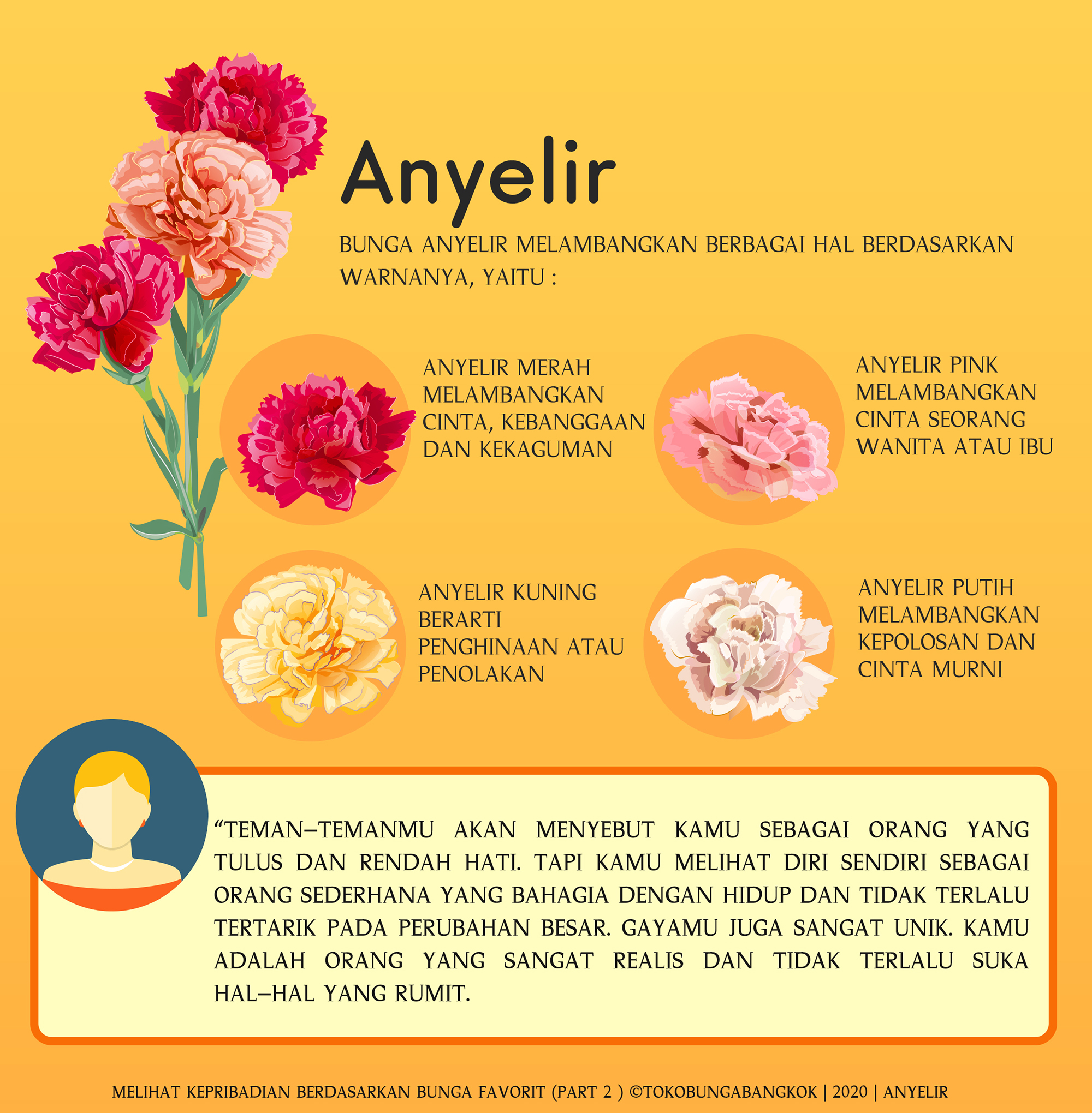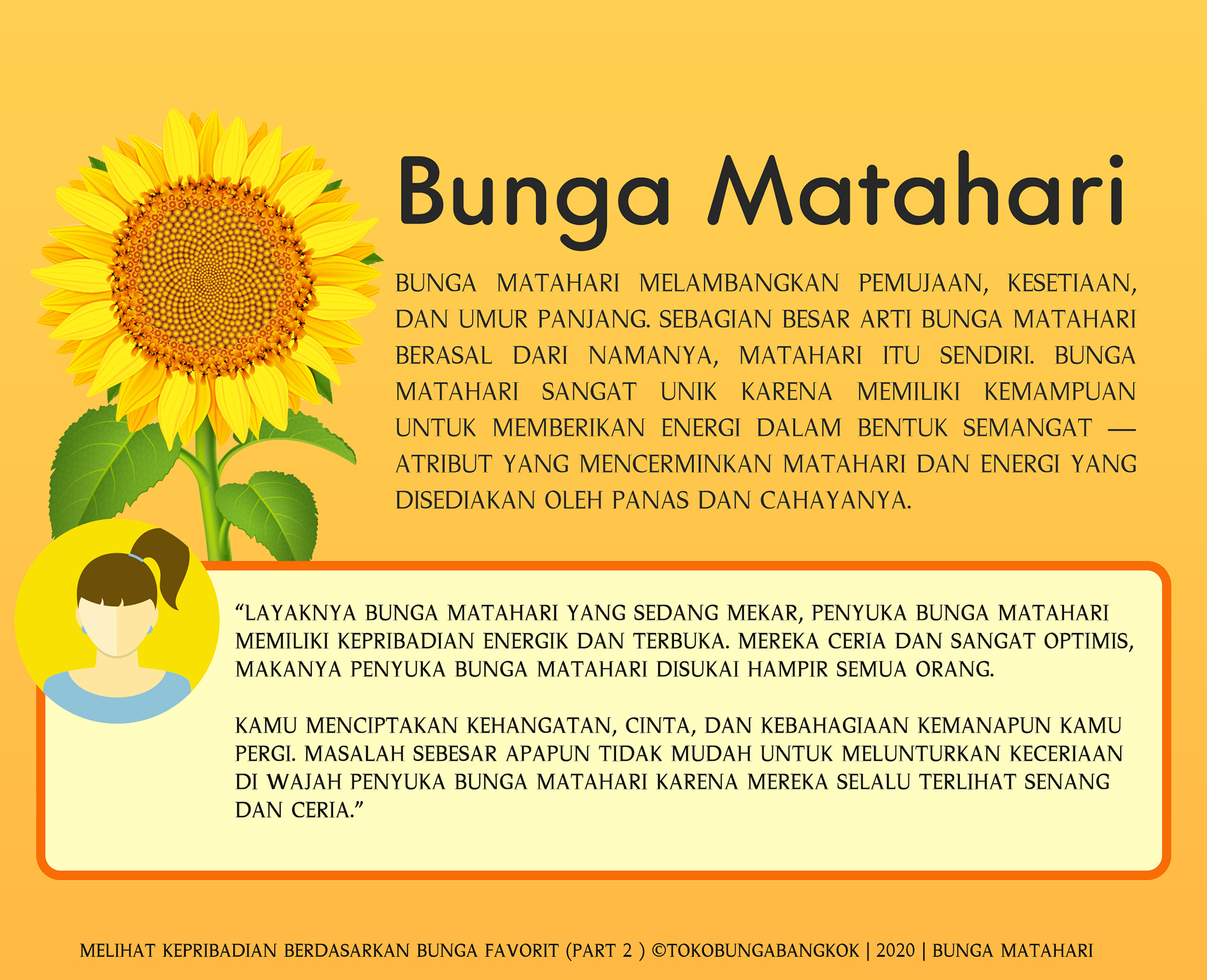 Nah, sekarang kamu sudah tahu kan apa arti bunga favoritmu dan hubungannya dengan kepribadianmu. Apakah simbol dan arti setiap bunga kesukaan ini sesuai dengan kepribadianmu?