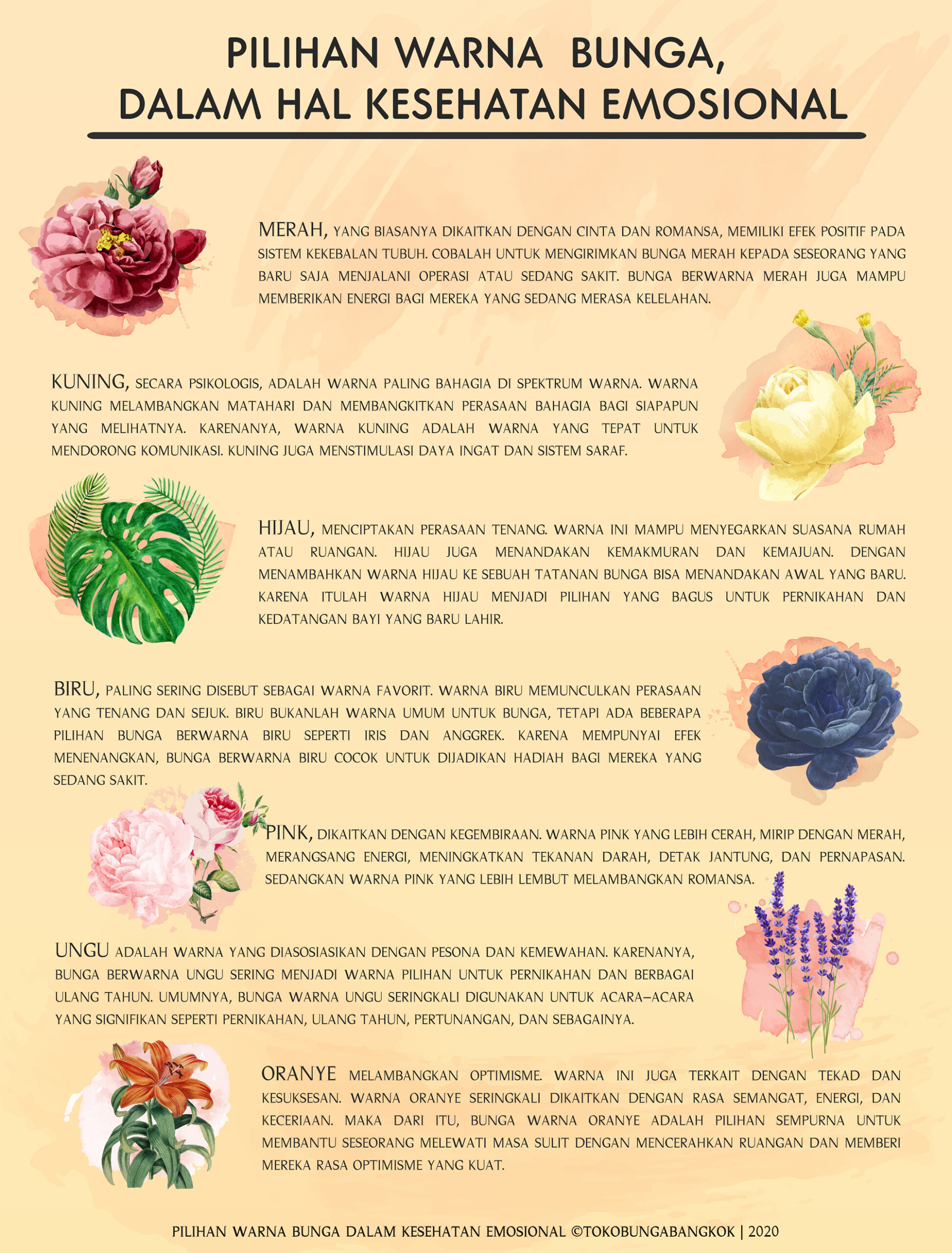 Ketika seseorang mengirim bunga — atau membelinya untuk kesenangan diri sendiri — jenis bunga yang mereka pilih berperan penting dalam meningkatkan mood tertentu. Bunga warna menyala seperti merah, kuning, dan oranye meningkatkan energi dan merangsang otak, membuat orang lebih tajam dan kreatif.